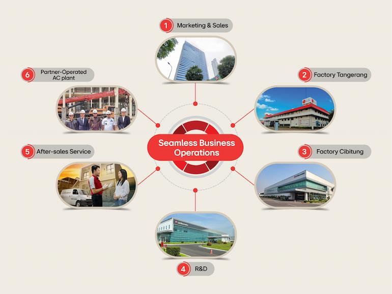 امروزه عملیات ما که شامل تحقیق و توسعه، تولید، بازاریابی و خدمات مشتری است، بهصورت کامل در داخل کشور انجام میشود و بیش از ۴۰۰۰ نیروی محلی را توانمند میسازد. این فعالیتها از اولویتهای ملی همچون برنامه «ساخت اندونزی ۴.۰» و نقشهراه خدمات صنعتی حمایت میکند و نوآوری، کارایی عملیاتی و رضایت مشتری را ارتقا میدهد.